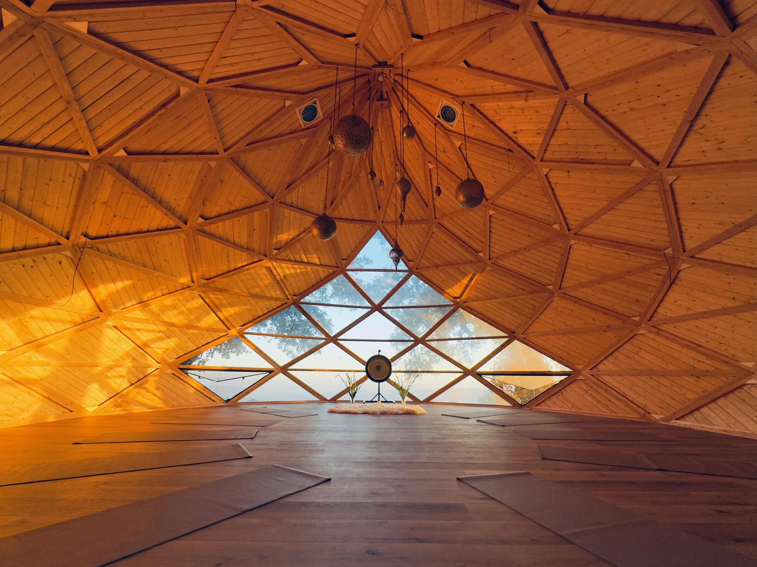 A key feature of our site is The Temple, a 33-foot diameter, 20-foot tall architectural structure built on the principles of polar zonohedral geometry. Outfitted with over 500 individually addressable LEDs woven into its framework, the Temple serves as a dynamic research environment and performance space. Its lighting system can be driven by real-time physiological data streams, enabling embodied, ambient representations of internal and collective states.